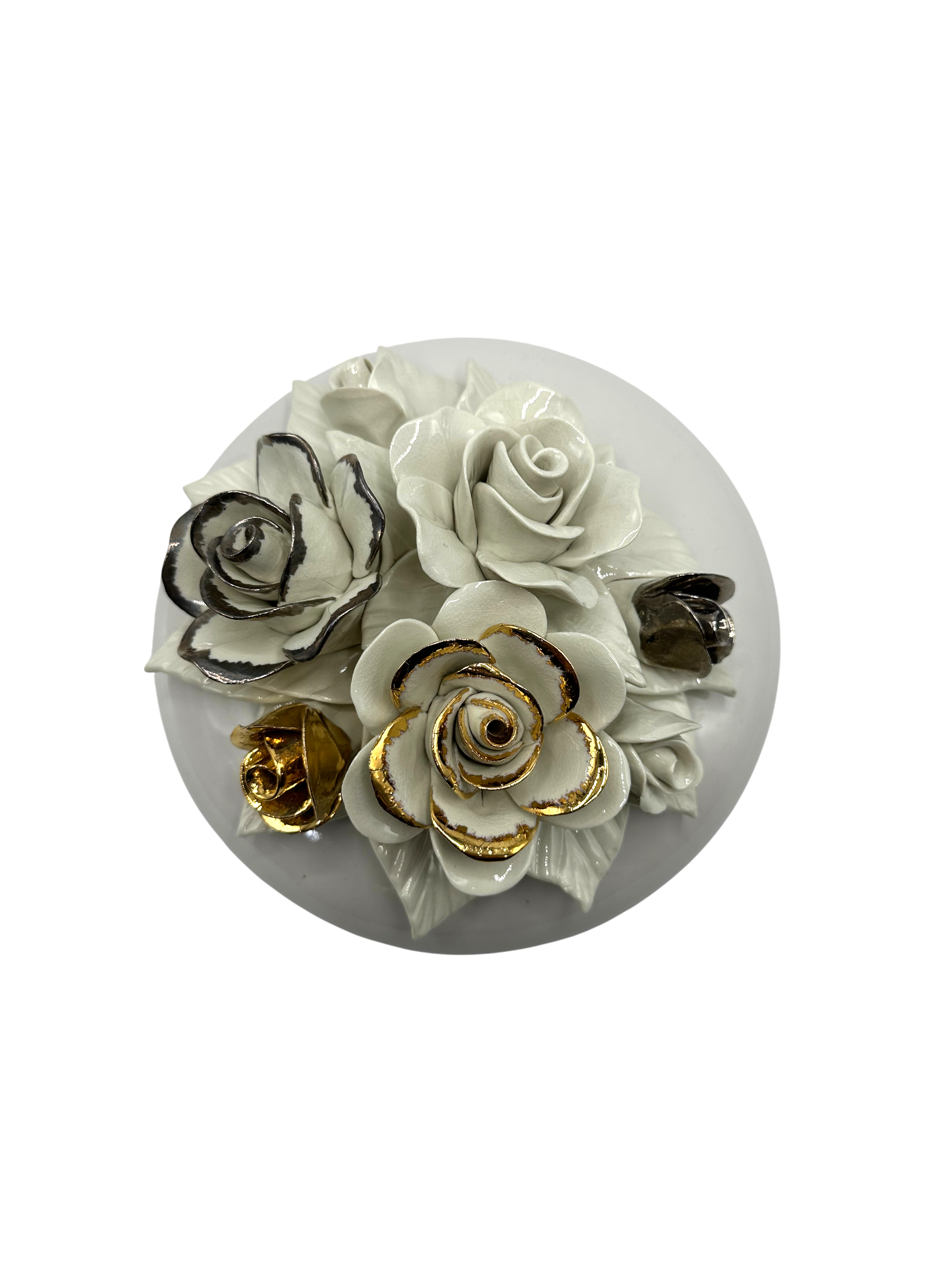 Inspirée par les porcelaines créées au XIXe siècle, cette composition allie la pureté de la porcelaine à la splendeur de l'or et du platine 22 carats.